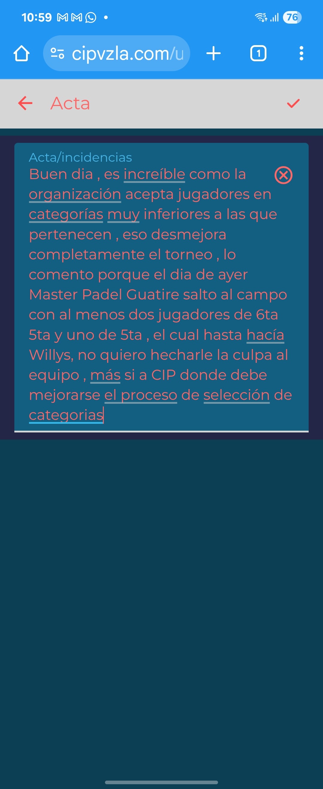 eso desmejora completamente el torneo , lo comento porque el dia de ayer Master Padel Guatire salto al campo con al menos dos jugadores de 6ta 5ta y uno de 5ta , el cual hasta hacía Willys, no quiero hecharle la culpa al equipo , más si a CIP donde debe mejorar el proceso de selección de categorias, y poner más vigilancia a los equipos