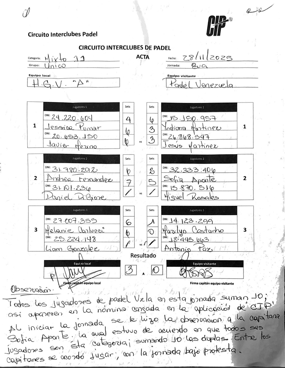 Todos los jugadores de padel Vzla en esta jornada suma 10, así aparecen en la nómina que está cargada en la aplicación de CIP. Al iniciar la jornada se le hizo la observación a la capitana Sofía Aponte la cual estuvo de acuerdo en que todos sus jugadores son categoría 5ta sumando así +10. Entre los capitanes se acordó jugar, con la jornada bajo protesta.
