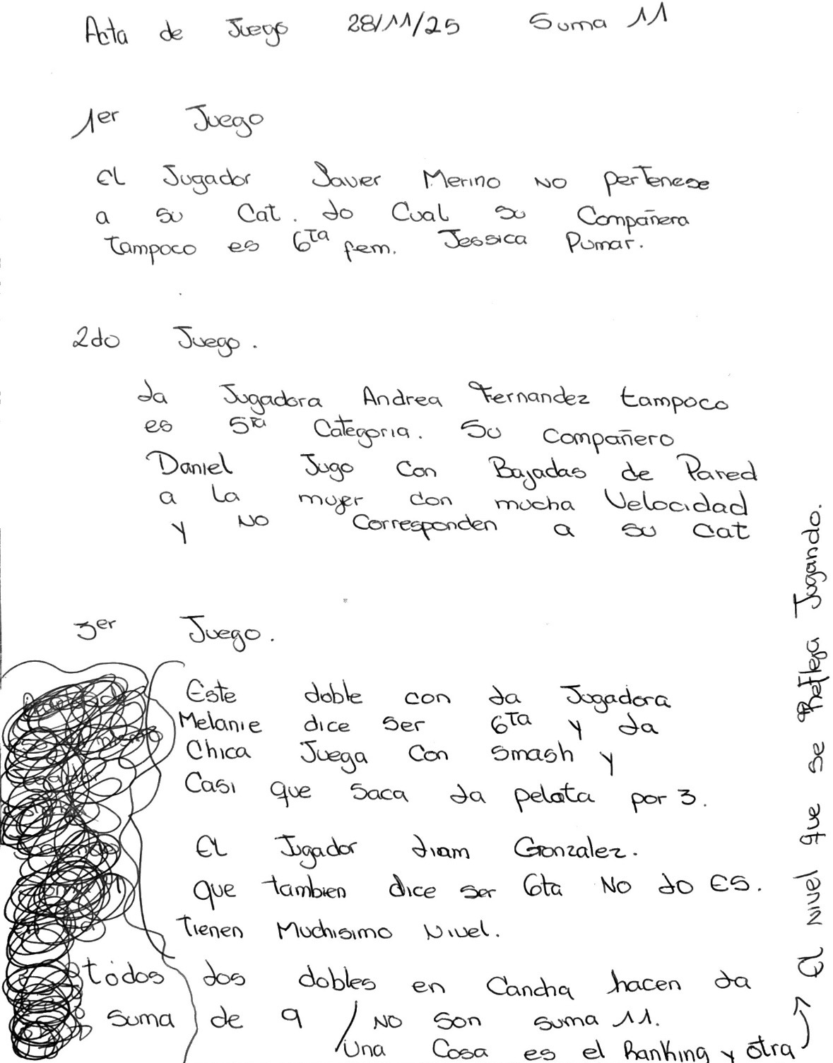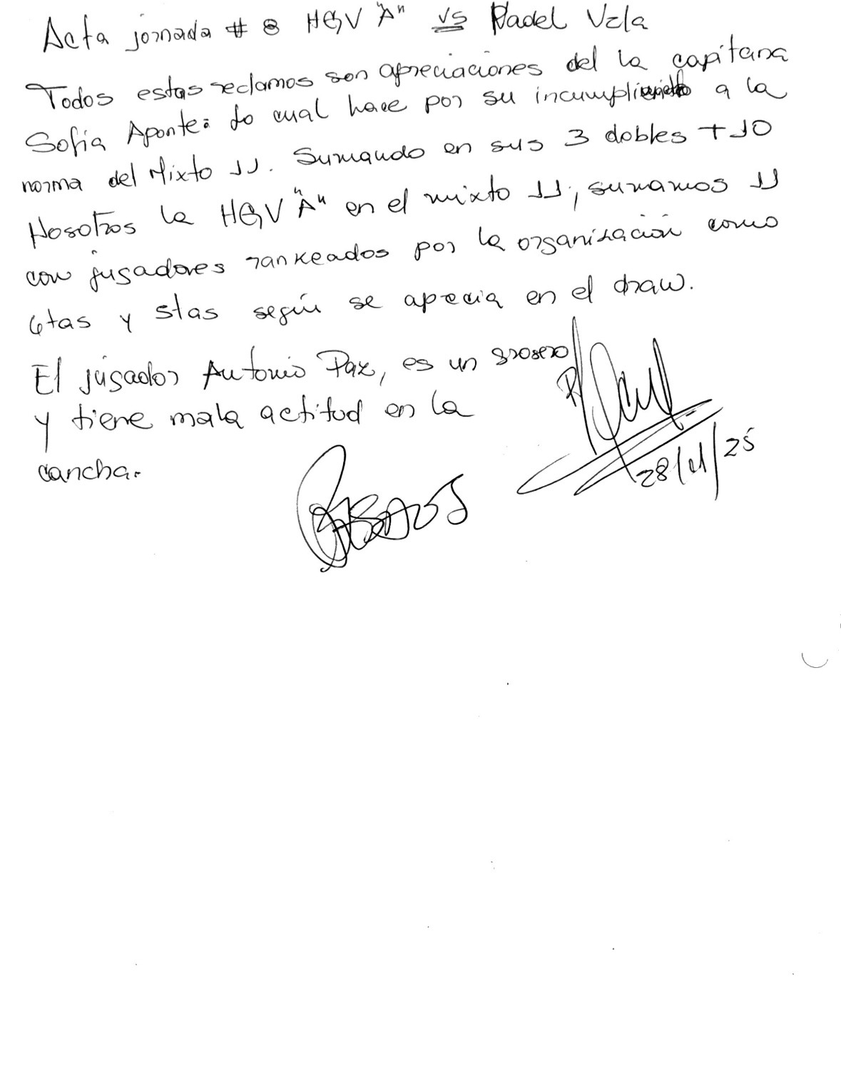 Todos los reclamos son apreciaciones de la capitana Sofía Aponte, lo cual hace por su incumplimiento a la norma que se refleja en mixto suma 11, sumando con sus tres dobles +10. Nosotros en nuestro equipo sumamos 11 con jugadores rankeados por la misma organización como 6tas y 5tas según se aprecia en el ranking.